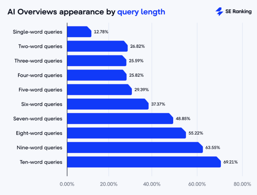 AI Overviews appear far more often in longer, more specific searches. Short queries show low visibility, with single word queries at 12.78 percent and three word queries around 25 percent. The numbers climb as intent becomes clearer, reaching 48.85 percent for seven word queries and peaking at 69.21 percent for ten word queries. This shows AI results are heavily triggered by detailed, multi word queries. (SERanking)